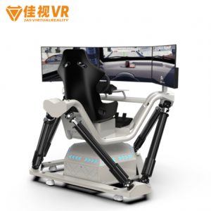 Three-screen six-axis racing simulator utilizes the coordinated extension and retraction of six electric actuators to achieve full-range motion, including heave, pitch, roll, sway, surge, and yaw.